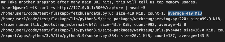 - Finally hit http://127.0.0.1:5000/capture again to take a snapshot to know which line has the most allocation.
